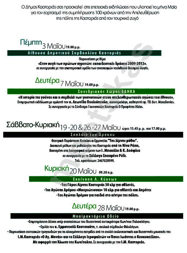 Θεατρική παράσταση στη "Σπηλία του Δράκου", Αγώνες δρόμου, Ιστορία της γούνας και άλλα ενδιαφέροντα στο επίσημο πρόγραμμα του Δήμου Καστοριάς για τον εορτασμό της συμπλήρωσης 100 χρόνων από την Απελευθέρωση τns πόλης από τον τουρκικό ζυγό.