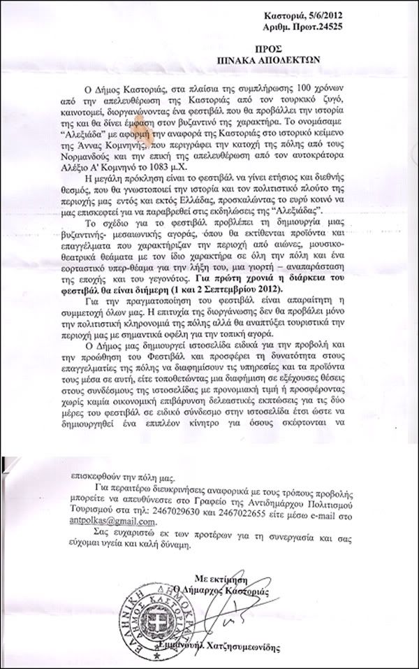 Για το παρόν όμως συνημμένο έγγραφο δεν μπορώ να συμμεριστώ άποψη, που θα το θεωρούσε ατυχές συντακτικό εγχείρημα διότι και στο παρελθόν εξεδόθησαν παρόμοια έγγραφα από τον ίδιο φορέα (αντιδημαρχία «πολιτισμού»-τουρισμού), άσχετα αν τώρα υπογράφεται από το Δήμαρχο...